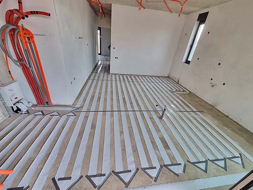 Na slici ispod prikazan je primjer ugradnje sustava podnog grijanja, u ovom slučaju na betonsku ploču s toplinskom izolacijom, tankim završnim slojem betona i podnom oblogom.